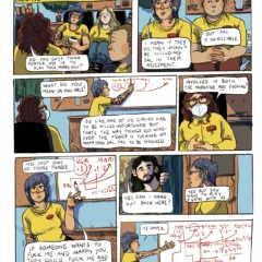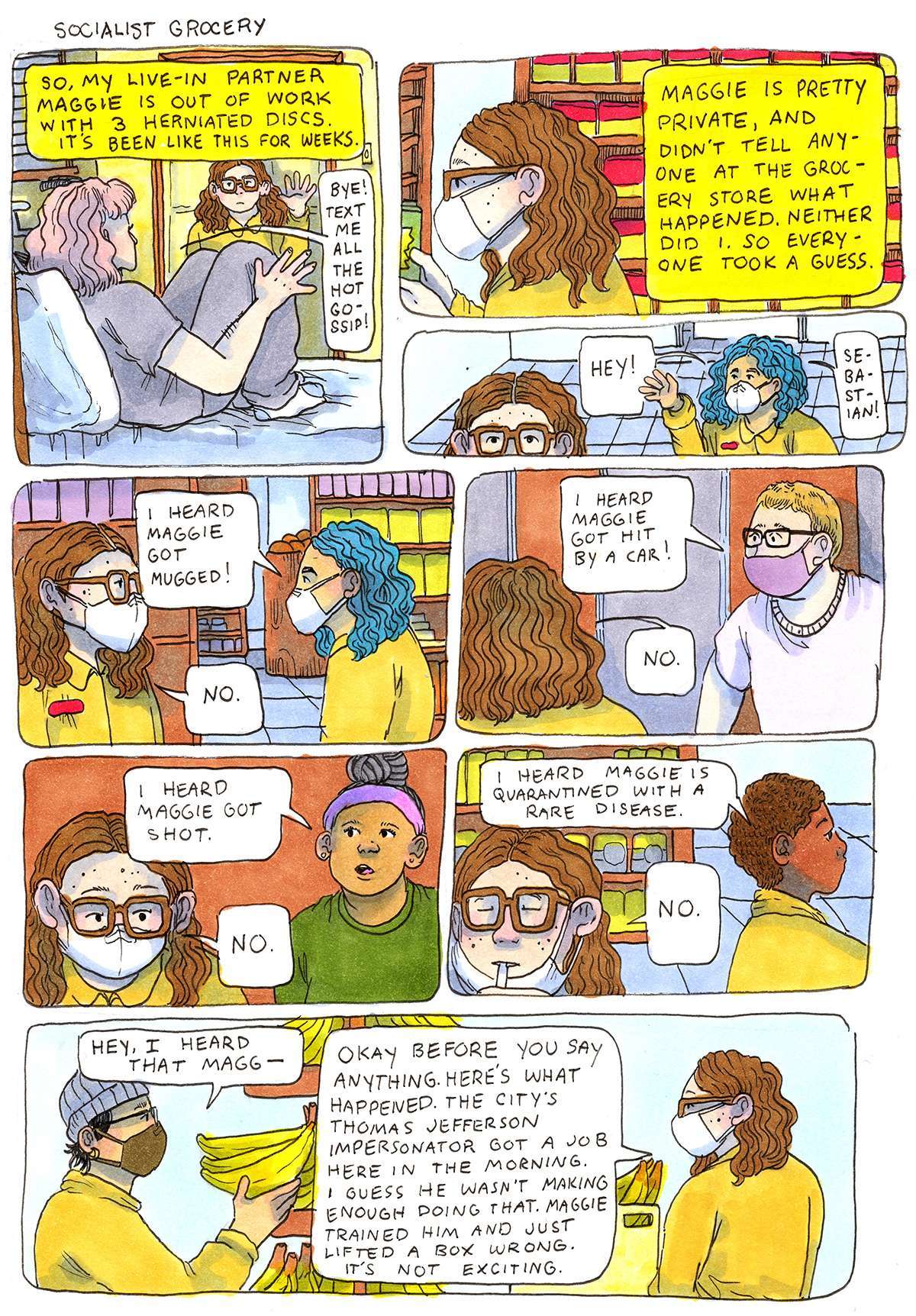 8-panel comic part of the series Socialist Grocery by Oli Knowles. Panel 1: Sebastian narrates, “So, my live-in partner Maggie is out of work with 3 herniated discs. It’s been like this for weeks. Maggie sitting in bed says, “Bye! Text me all the hot gossip.” Panel 2: Sebastian continues to narrate, “Maggie is pretty private, and didn’t tell anyone at the grocery store what happened. Neither did I. So everyone took a guess. Panel 3: A coworker stops Sebastian, “Hey, Sebastian.” Panel 4: The co-worker says, “I heard Maggie got mugged.” Sebastian corrects, “No.” Panel 5: Another co-worker says, “I heard Maggie got hit by a car.” Sebastian corrects, “No.” Panel 6: Another co-worker says, “I heard Maggie got shot.” Sebastian corrects, “No.” Panel 7: Yet another co-worker says, “I heard Maggie is quarantined with a rare disease.” Sebastian corrects, “No.” Panel 8: The last co-worker says, “I heard Magg-,” but before they can continue Sebastian says, “Okay before you say anything. Here’s what happened. The city’s Thomas Jefferson impersonator got a job here in the morning. I guess he wasn’t making enough doing that. Maggie trained him and just lifted a box wrong. It’s not that exciting.”
