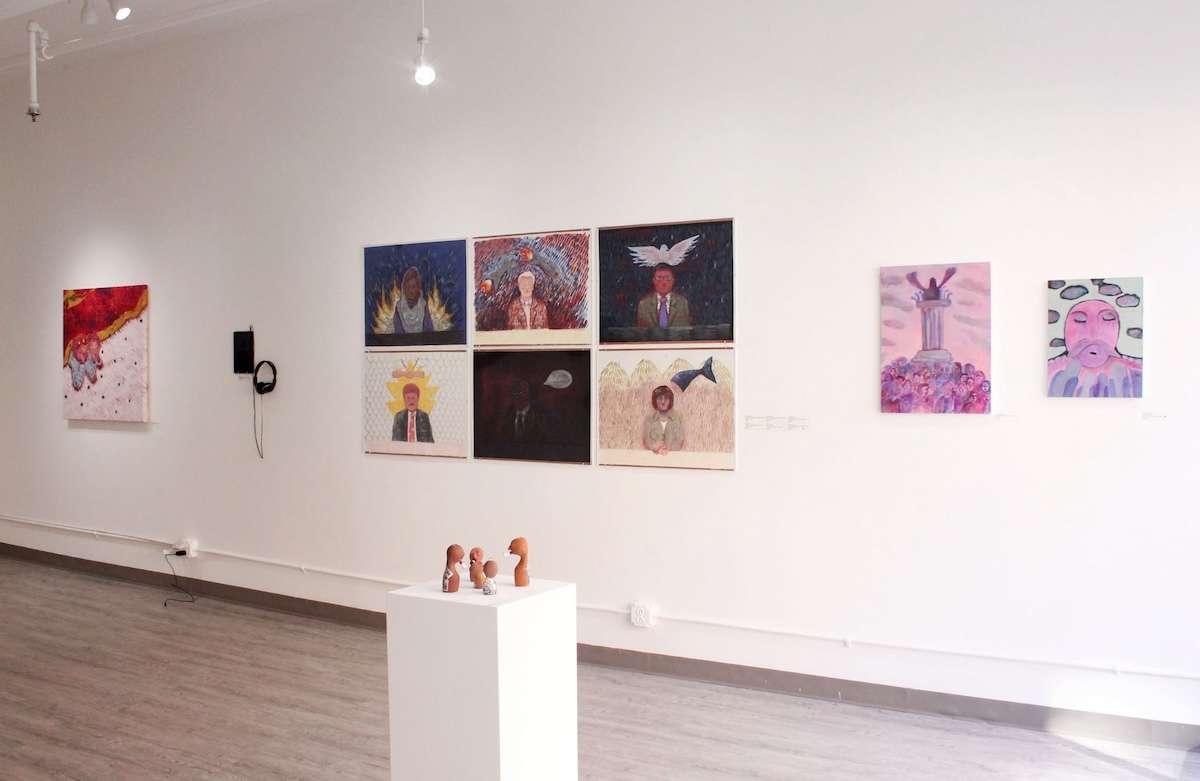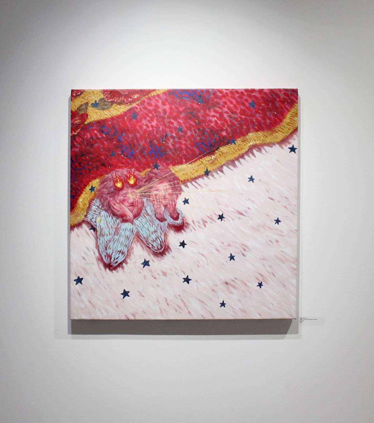 The exhibit as a whole functions is as informative to an audience aware of its milieu as it is to a visitor engaging with the artwork without that foreknowledge. On first impression, the entire exhibit glows with the hues of pinks, baby blues, and yellow, with animated figures whimsically suggesting a more sophisticated sentiment behind their cartoonish exteriors. The artworks’ appearances are childlike not just by coincidence, invoking tender and innocent imagery at first glance, without seeming innately petulant and juvenile.