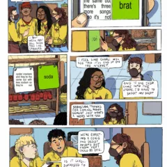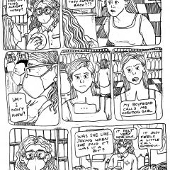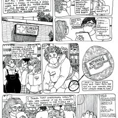 Panel 1: Sebastian narrates, “So, on the busiest day of the year, January second, our power suddenly went out.” The scene shows the front of the socialist grocery with people milling outside. Panel 2: Sebastian continues, “We were instructed to stand in the freezing cold parking lot until PECO arrived. Which took many hours.” The scene shows a sign board with three signs taped to it: top sign-“Power’s out. Be back in 1 hour.” Middle sign-“Okay be back in 3 hours.” Bottom sign-“Okay maybe tomorrow.” Panel 3: The next scene shows a red-haired woman manager her arms open talking to the crowd of workers, whose heads you see from the back at the bottom of the frame. She is telling them, “But the good news is, if you have a car, you can go stay warm in your car! Go Ahead!” Panel 4: And in the next frame, when it’s clear that the 20-something workers have not moved an inch, she says, looking sheepish, “…Nobody owns a car?” Panel 5: Then, in the next scene, Sebastian raises a hand and says, “Wait, so what if PECO comes and says they can’t turn the power back on until tomorrow?” And the voice of the manager (not seen) says, “You’ll go inside and wipe shelves and spoil expired food!” Panel 6: Continuing on, the scene shows a worker face to face with the manager, asking the question, “So – go back to work with no light or heat?” Panel 7: And in the next panel, the manager says, “Uh – yes. Which might actually be legal!” Panel 8: She smiles and follows up with this: “Don’t worry – we’ve got your back. The managers got Dunkin.” The scene shows a person looking sheepish and carrying a box of Dunkin. Panel 9: “AND bagels from some other place!” Scene shows a person looking sheepish and carrying a box of bagels. Panel 10: A voice from an unseen worker shouts, “What? No pizza? We should have pizza!” Echoed by another worker, who says “Yeah, c’mon, no pizza?” In the scene, the manager who looks perplexed says, “…I thought we weren’t supposed to do that anymore…”