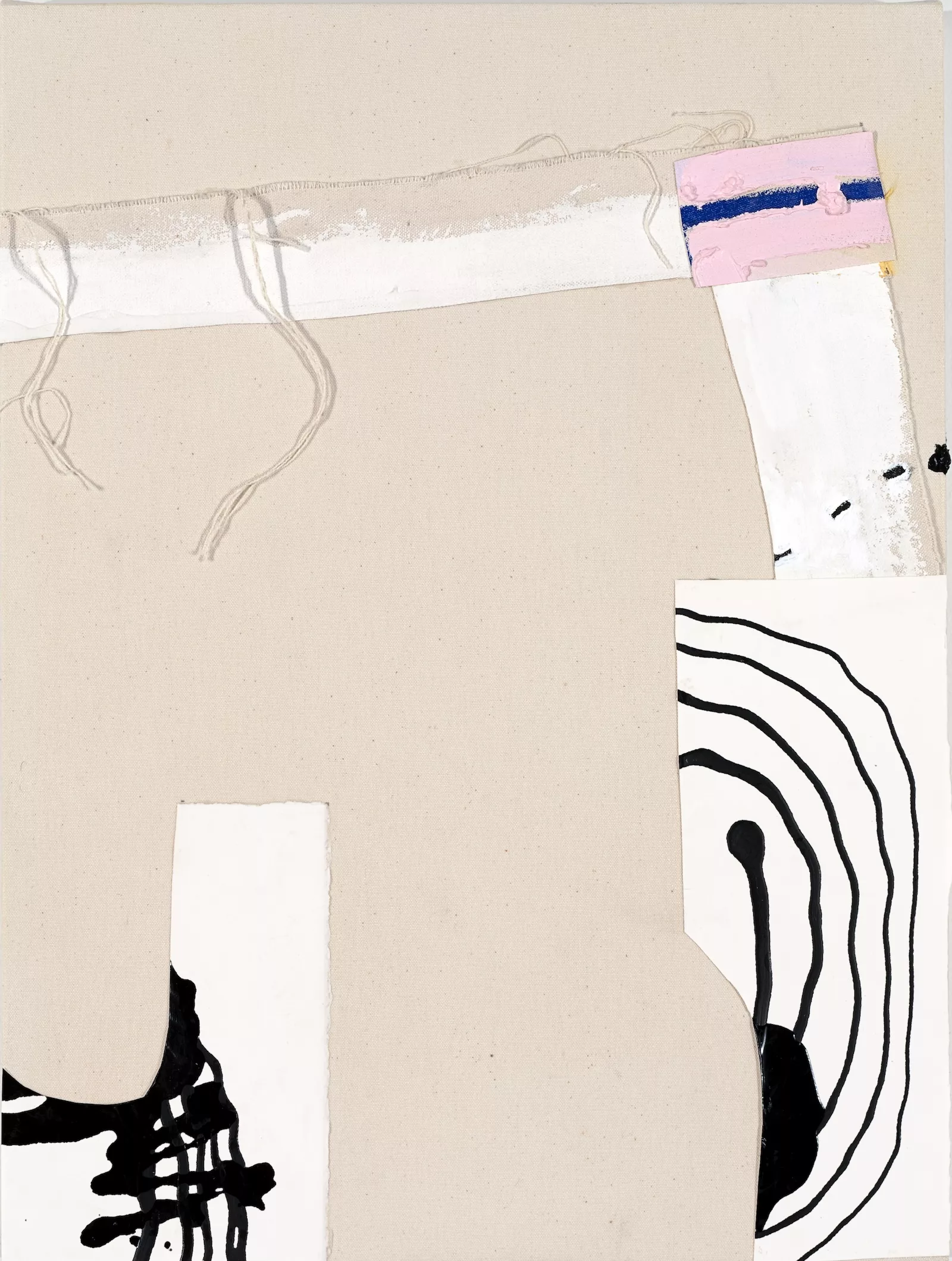 In Smail’s “Virtuoso Fingers”, canvas – a woven textile – is shown off with painted and collaged elements sparsely and superbly placed. Loose threads unravel from another strip of partially painted canvas. Collage elements with black and white lines echo thread lines. A pink- and black-painted rectangle creates an asymmetrical balance. Smail creates spaces that are at once teetering and balanced, expansive and intimate.