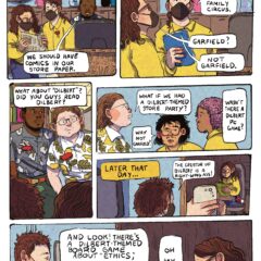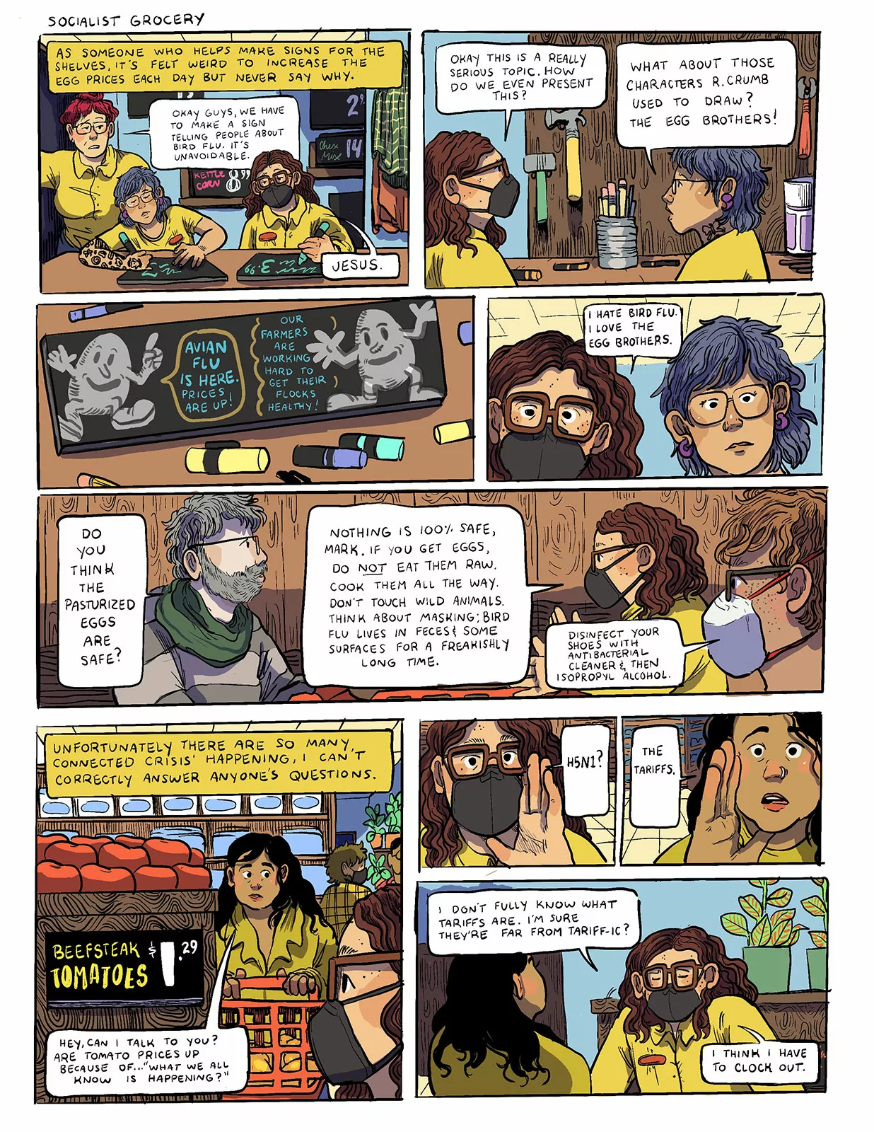 Panel 1: Sebastian narrates, “As someone who helps make signs for the shelves, it’s felt weird to increase the egg prices each day but never say why.” A Co-worker enters the room, “Okay guys, we have to make a sign telling people about bird flu. It’s unavoidable.” Sebastian, “JESUS.” Panel 2: Sebastian and the other artist try to make a plan. Sebastian says, “Okay this is a really serious topic. How do we even present this?” The other co-worker responds, “What about those characters R.Crumb used to draw? The Egg Brothers?” Panel 3: We see a board with two characters akin to the Egg Brothers. The board reads, “Avian Flu is here. Prices are up! Our farmers are working hard to get their flocks healthy.” Panel 4: Sebastian reflects on the board, “I hate bird flu. I love the Egg Brothers.” Panel 5: Sebastian and a co-worker are talking to a customer. Mark, the customer asks, “Do you think the pasturized eggs are safe?” Sebastian responds, “Nothing is 100% safe, Mark. If you get eggs, do NOT eat them raw. Cook them all the way. Don’t touch wild animals. Think about masking. Bird flu live in feces & some surfaces for a freakishly long time.” The co-worker adds, “Disinfect your shoes with antibacterial cleaner & then isopropyl alcohol.” Panel 6: Sebastian narrates, “Unfortunately there are so many connected crisis happening, I can’t correctly answer anyone’s questions.” A customer asks, “Hey, can I talk to you? Are tomato prices up because of…”what we all know is happening?” Panel 7: Sebastian whispers a clarifying question, “H5N1?” Panel 8: The customer responds, “The tariffs.” Panel 9: Sebastian responds, “I don’t fully know what tariffs are. I’m sure they’re far from tariff-ic? I think I have to clock out.”