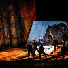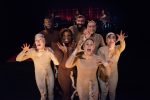 I was struck by the existential breakdown of communication that Tatarsky and her creative team embedded within the ridiculous plots, cabaret singing, and strangeness bubbling just under the surface of the human psyche. There is something senseless, yet deeply political in the clownery and shenanigans of Tatarsky’s hellscape – a hell scenographically represented by hand-painted miniature cardboard flames that Tatarsky hilariously shuffles across the floor to emphasize that we are, in fact, experiencing hell right now.