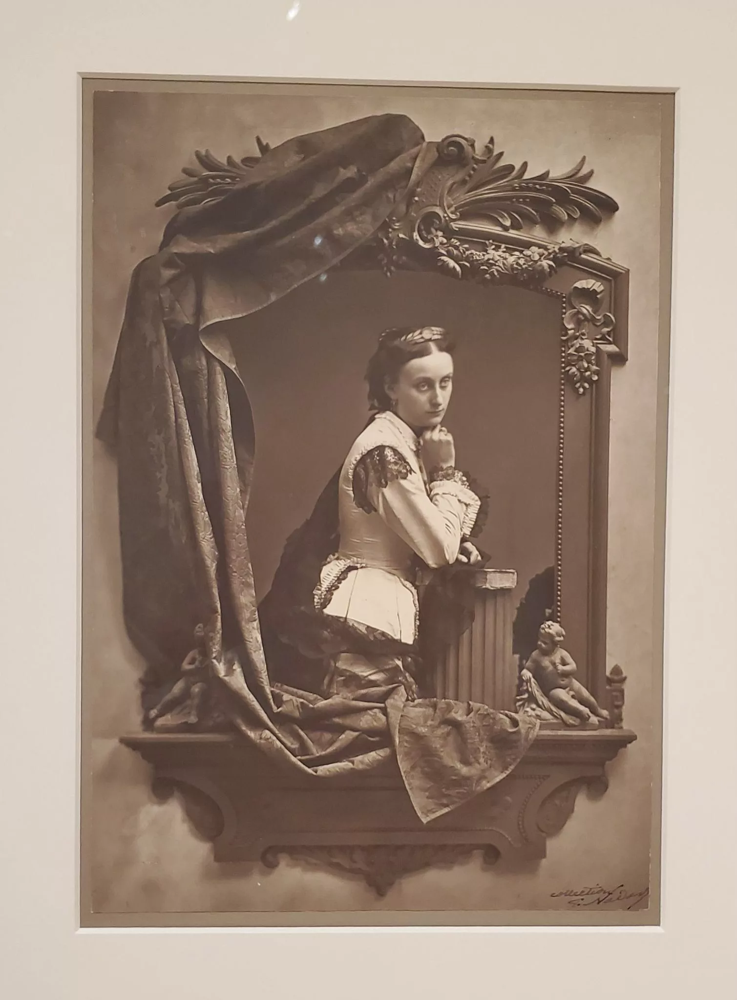 One of the earliest works in the gallery, Adolphe Jean Francois Martin Dallemange’s “Princess Olga Cantacuzene” (1860) has a more complex composition than other photography displayed from that era. It features a woman who is assumedly the photo’s namesake, Princess Olga, in fine clothing framed by an ornate window. The unique use of a framed window with a flat interior gives it an almost two dimensional feel. The piece blurs the line between photography and the traditional painted portraiture of the time.