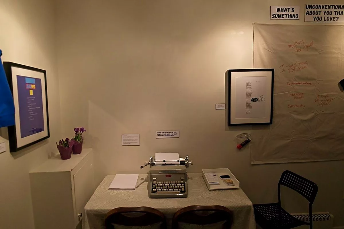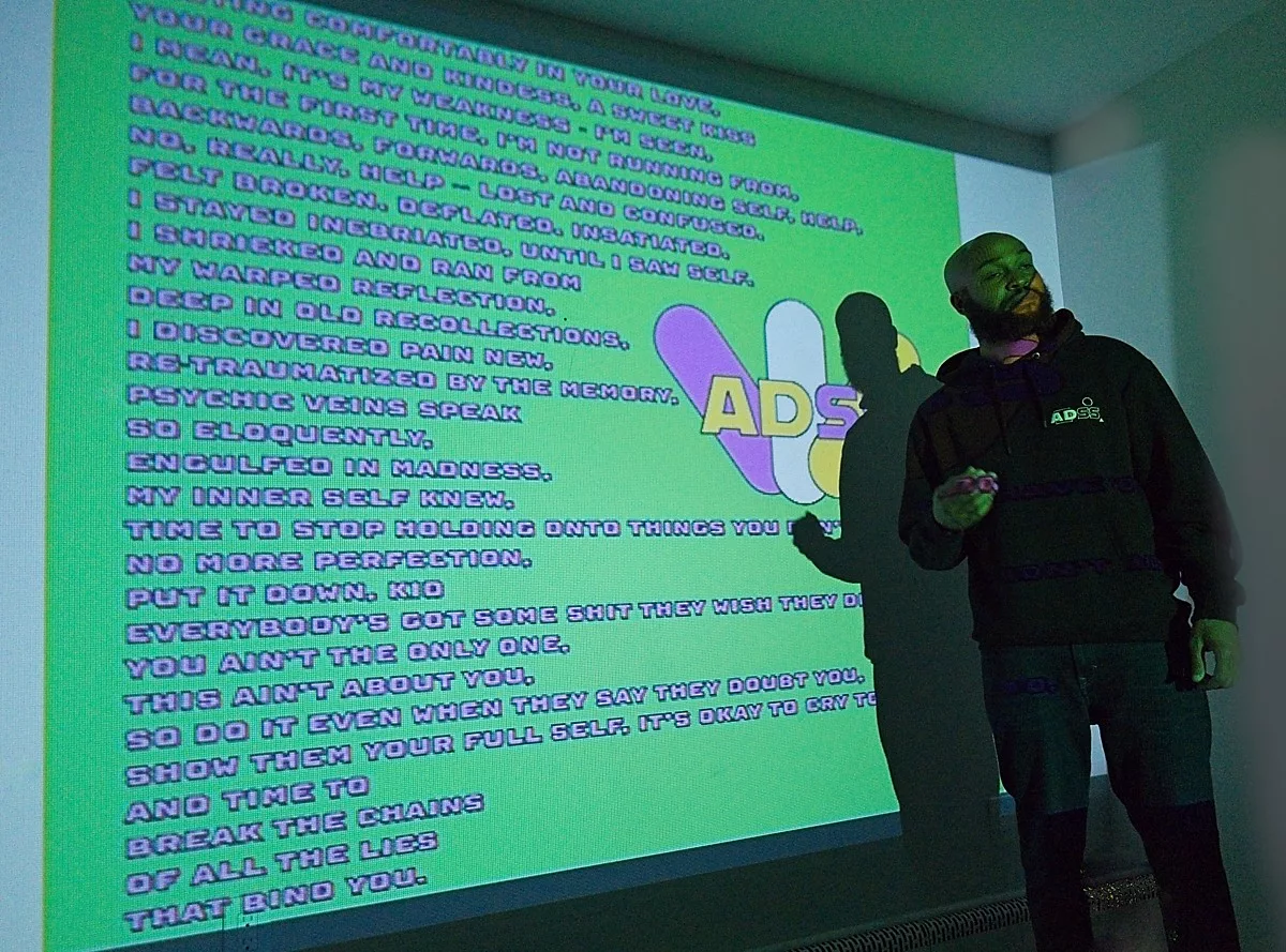 Unlike traditional poetry readings where audiences are mostly passive, Versescape invites active engagement through multiple layers of interaction. Participants might write on the walls in what he calls Textual Tapestries, play a poetry-based game called Poetry Pieces, or contribute their thoughts digitally via the Verse Vault, an immersive activity that allows for silent participation. Even during live performances, audience members can engage through digital responses projected onto a screen, fostering a communal dialogue that extends beyond the poet’s voice.