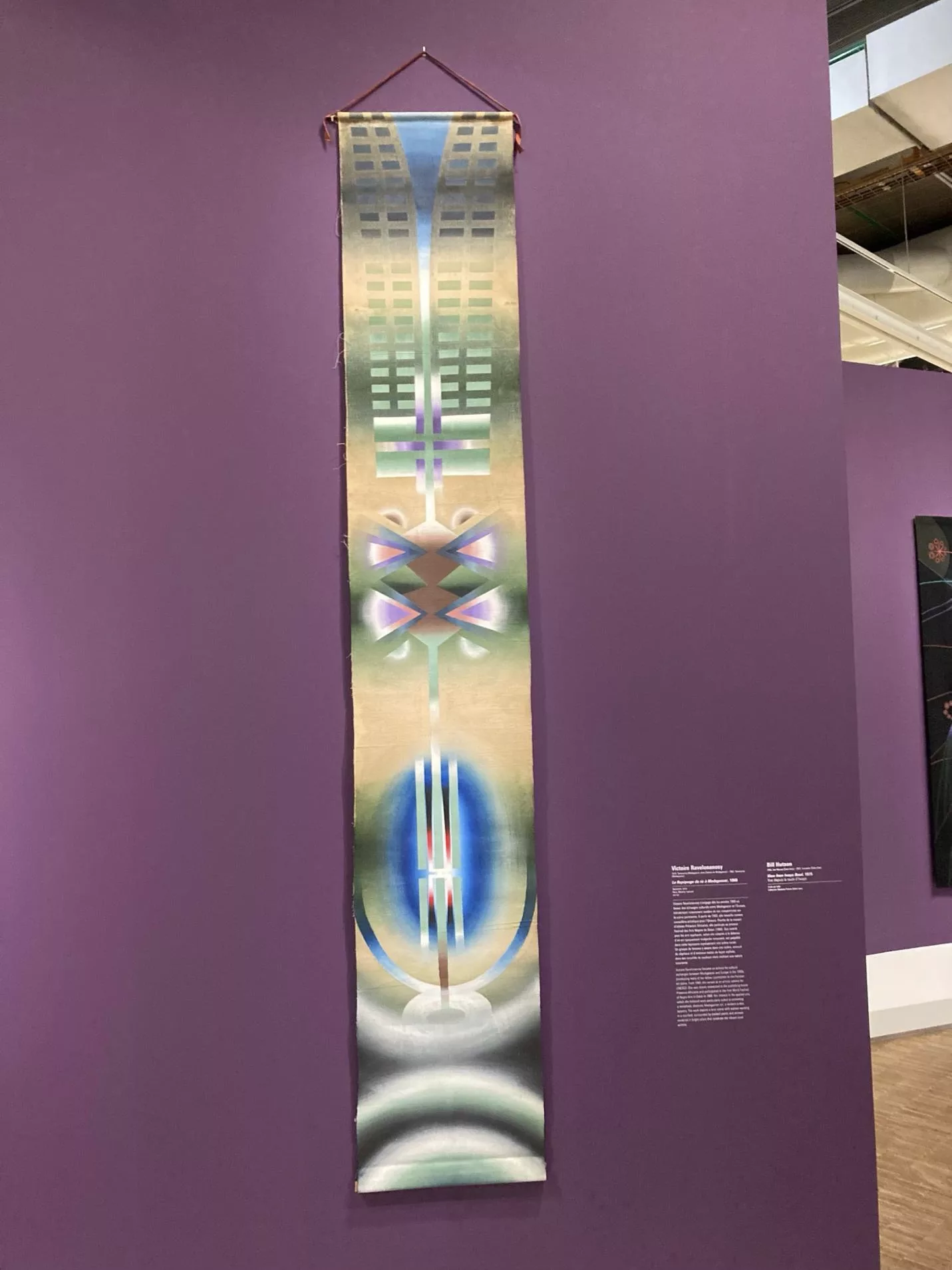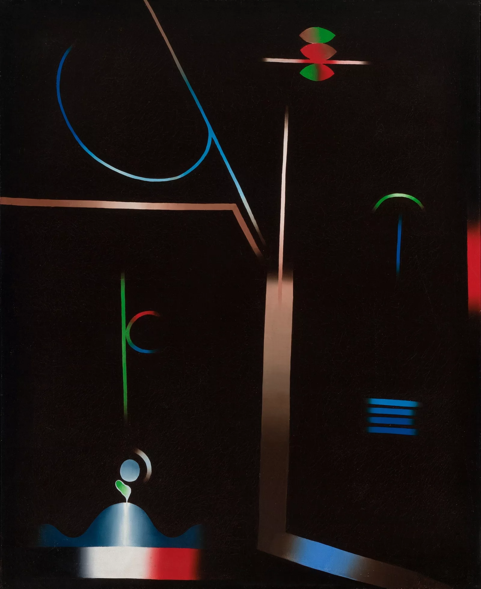 Like many of Hutson’s paintings, the clear edges of quasi-architectural forms in “Study for a Black Painting” (1970) suggest coherence and organization while remaining resistant to explanation. Strange, mobile forms in color float on a glossy surface, offering no clear meaning or narrative. Held in the Petrucci Family Foundation Collection (Asbury, NJ), this luminous painting draws in the viewer, even though there is little on which to anchor. “The View from Iwaya Road,” completed while Hutson lived and worked in Lagos, Nigeria more fully develops a language reliant on African symbols.