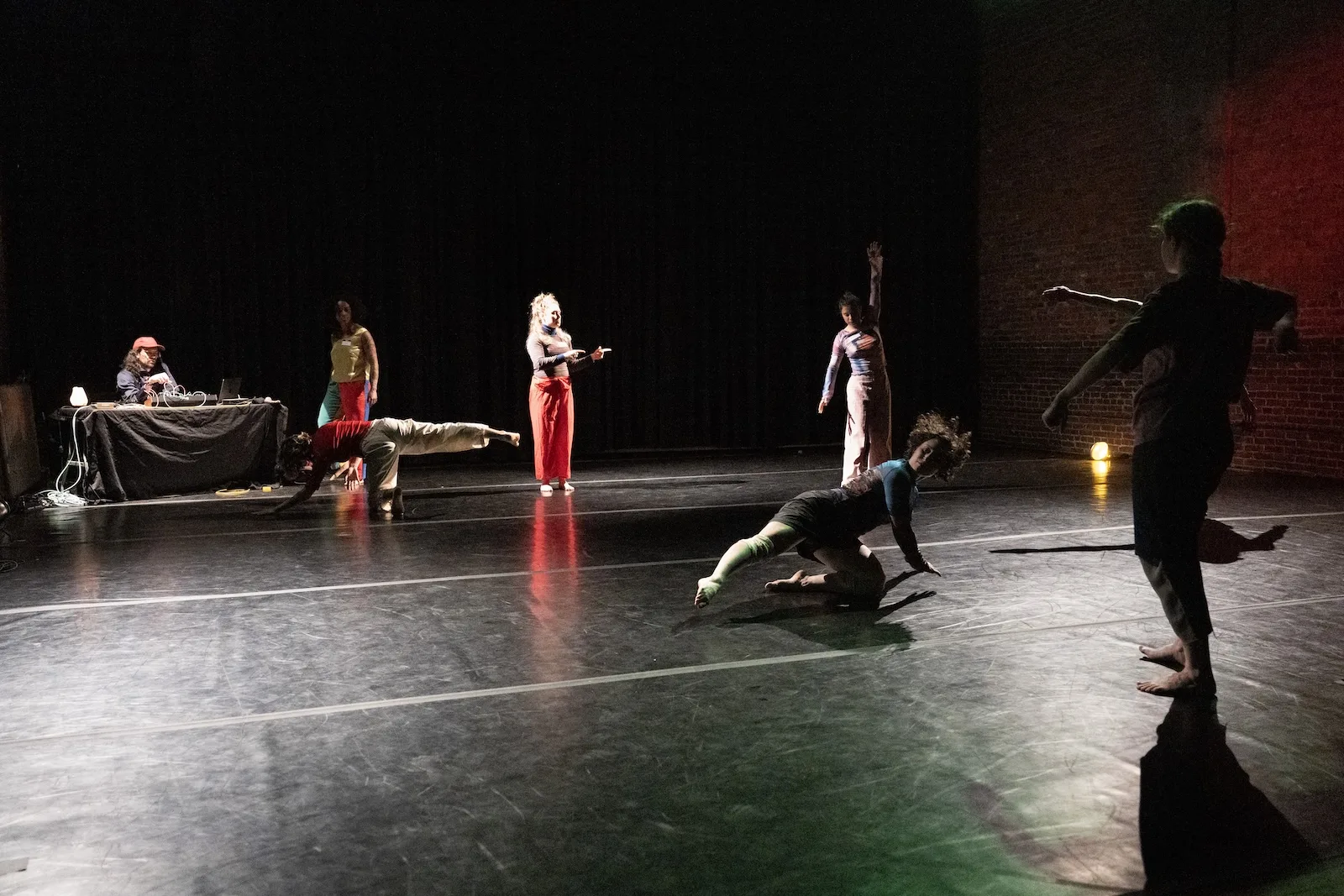 Finally, the group of seven dancers enters. Standing clustered at center stage, they whisper and gesture to each other for several minutes, an activity which I immediately recognize as them going over the show; to members of the audience who are not dance insiders this is probably an opaque moment. They finish and exit; shortly thereafter Chloe cues them with an “and” on the mic (imagine a conductor lifting their baton before the downbeat), and they enter again. This time, I notice they are all wearing name tags on their shirts.