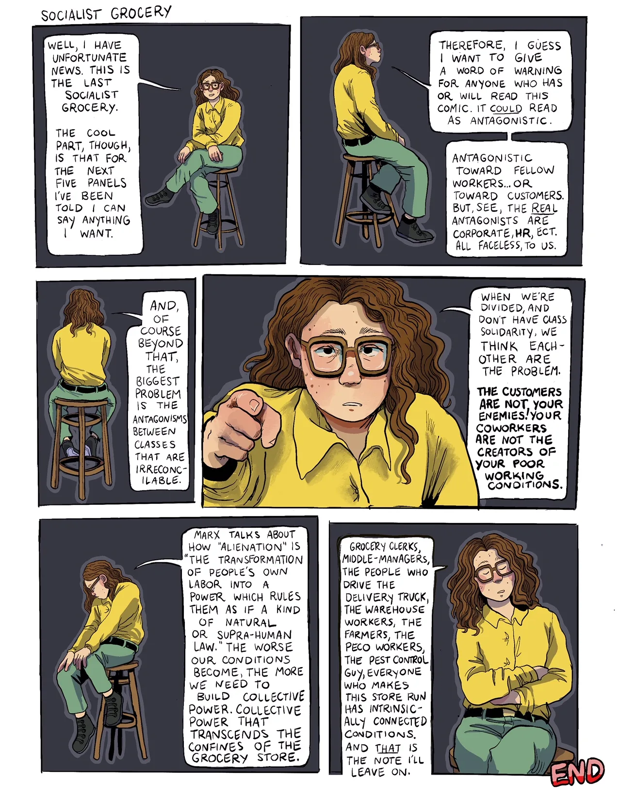 Panel 1: We see Sebastian sitting on a stool and mask off. “Well, I have unfortunate news. This is the last socialist grocery. The cool part, though, is that for the next five panels, I’ve been told I can say whatever I want.” Panel 2: “Therefore, I guess I want to give a word of warning for anyone who has or, will read this comic. It could read as antagonistic.” Panel 3: “And, of course beyond that, the biggest problem is the antagonisms between classes that are irreconcilable.” Panel 4: “When we’re divided, and don’t have class solidarity, we think each other are the problem.” Panel 5: “Marx talks about how ‘Alienation’ is ‘the transformation of people’s own labor into a power, which rules them as if a kind of natural or supra-human law.’ The worse our conditions become, the more we need to build collective power. Collective power that transcends the confines of the grocery store.” Panel 6: “Grocery clerks, middle-managers, the people who drive the delivery truck, the warehouse workers, the farmers, the peco workers, the pest control guy, everyone who makes this store run has intrinsically connected conditions, and that is the note I’ll leave on.”