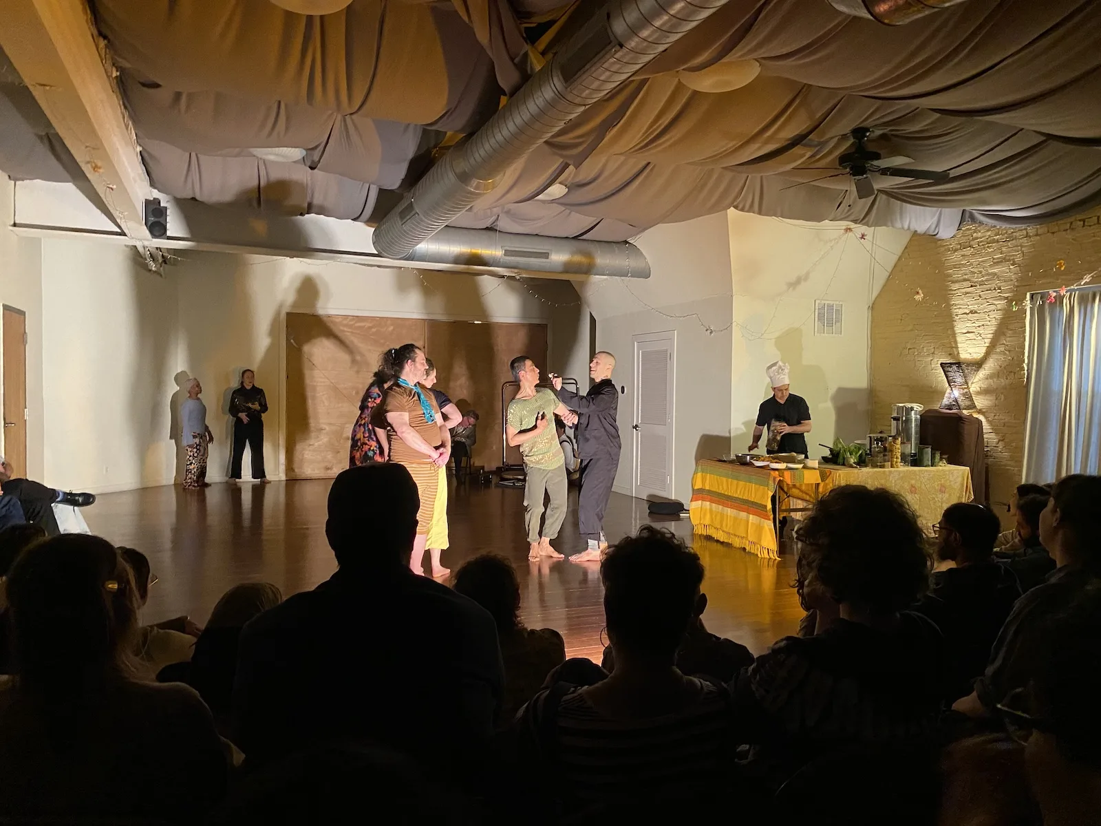 Juliette Lee, a Korean American poet in her 40s, walked through the moving bodies, reading her poems and layering spoken word into the collective rhythm. Then Germaine Ingram, a 78-year-old African American dancer, joined her, echoing the phrase: “What we have, that’s enough.” The atmosphere shifted when Dan Safer let their body wriggle across the knees of audience members seated in chairs. The room’s attention snapped back as Kim called Safer back to the stage. The disruption passed quickly. Soon all eleven performers were once again breathing together, folding their limbs back into the shared current. At the cooking station, the food began to boil and steam. Something fragrant and “healthy” cut through the damp air. The audience laughed when Kim reluctantly ate a piece of orange offered by Safer.